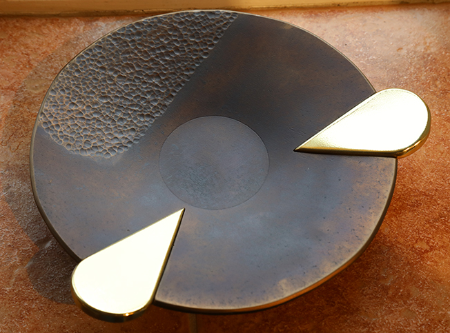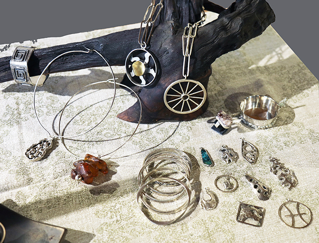 Olle Hellmouths silverobjekt på ett bord i mitten möter sedan Stefan Olsens tunga form- och stilsäkra järnsmide i geometriskt formspråk med guldeffekter av sällan skådat slag. Hans runda fat har perfekt kompisanda med keramikern Wicky Lundergren Anderssons fyrkantiga fat i fönstersmyg. Wickys personliga formspråk och unika berättarförmåga plockar här fram humorn i olika objekt – bl.a. i en kropp med två huvuden som går att vrida i samspråk eller ilska.