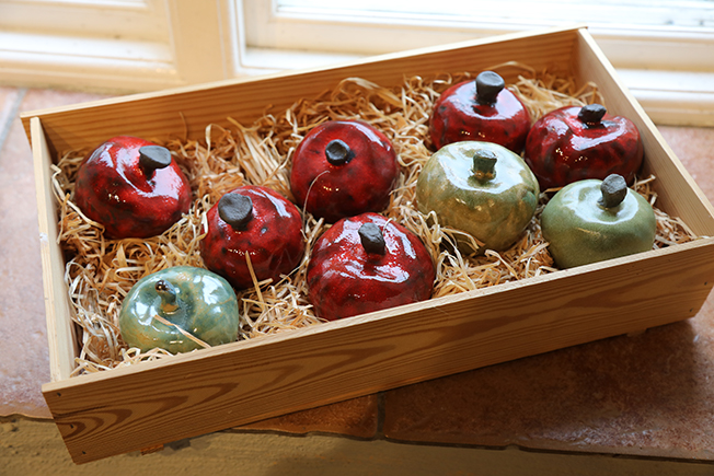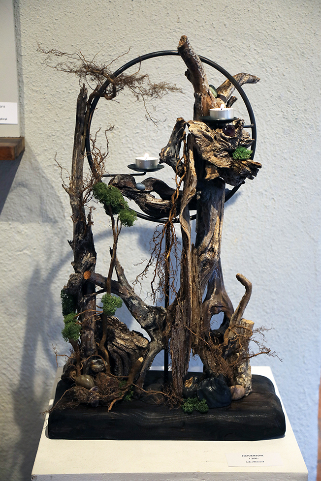 I olika hörn av nedre galleriet skapar Anki Ahlstrand naturkänsla och liv i sina höstliga, vackra, fantasifullt sköna golvobjekt.