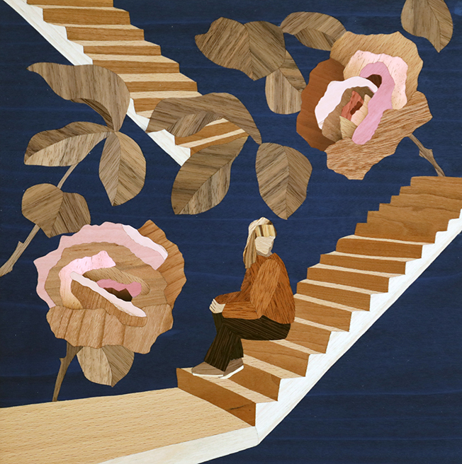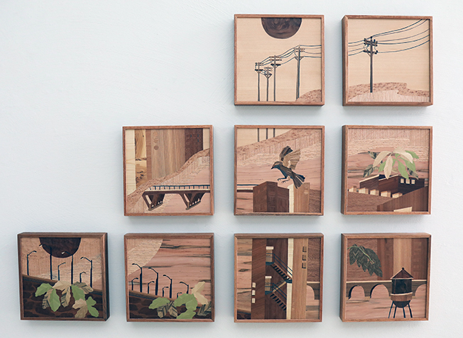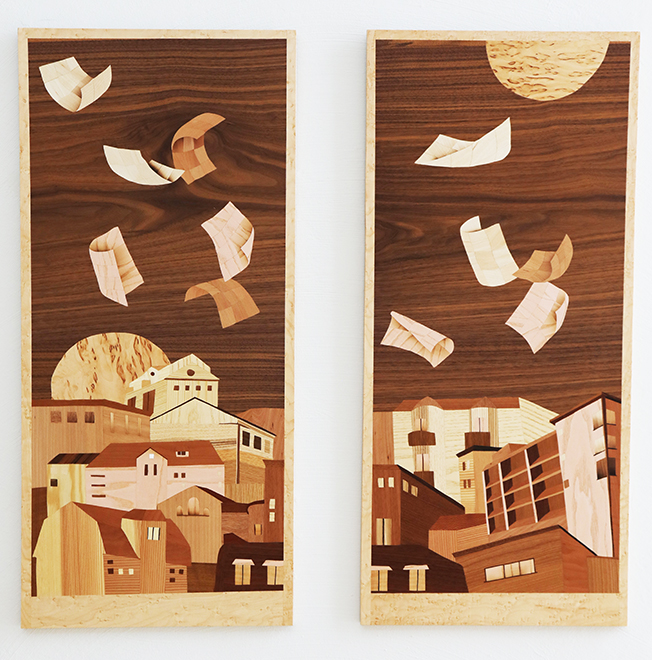De olika träslagens strukturer, fibrer, mönster och texturer utnyttjas subtilt och omsorgsfullt för att skapa en levande, plan yta. Körsbär, ask, mahogny, björk och ett tiotal träslag därtill kan hittas i hennes motiv.