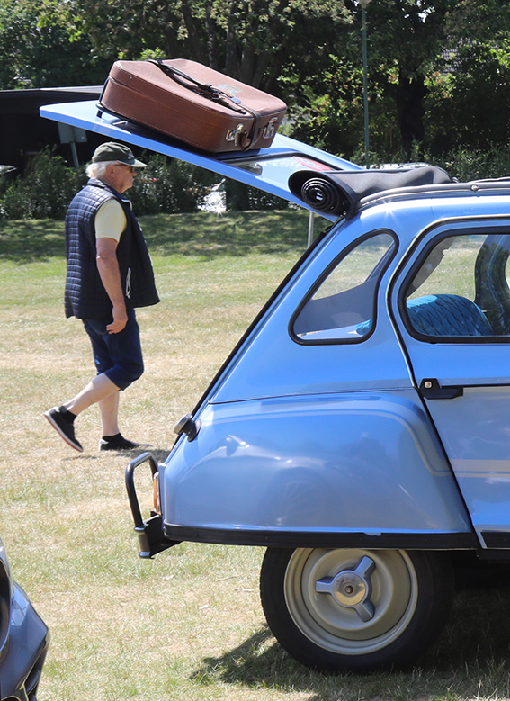 Söderåsrallyt 2023 tangerade förra årets deltagarantal – 200 ekipage Åstorp 230610 En Aston Martin hade också letat sig till Perslund där den tronade tillsammans med en mörkblå Rolls Royce som enligt presentationsskylten hade tjänstgjort vid Drottning Elisabeth av Storbritanniens statsbesök i Tjeckien 1996. Bilen lånades ut av RR:s återförsäljare, då den tjeckiska staten inta hade möjlighet att köpa den… Till rariteterna hörde även en Ferrari P 400, helt byggd i trä av en möbelsnickare i Indonesien och en Ferrarimotor G12 även den tillverkad i Indonesien men av en annan snickare. Lyckliga ägare till de båda byggena är bröderna Sven och Lasse Johansson från halländska Torup. Lite mer i skymundan, under ett träd i skuggan, satt Jan och Maj-Britt Gottfridsson och fikade bakom deras lilla fräscha Citroën CV2 med färgkod DOLLY.