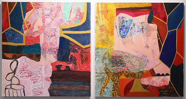 Susanna Salifou Nygren bjuder på kraftfulla, stramt tydliga målningar i olja och pigment. Skickligt utarbetad struktur på målningarna för tanken till textil.