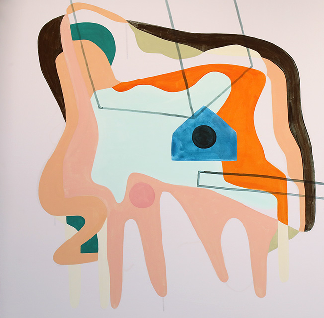 Vanja Gyllensköld arbetar i akryl och driver professionellt bestämt och lekfullt fram slingrande rörelser i färg och form i nonfigurativa motiv.