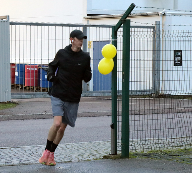 Den danska konstnären Jonas Erboe Rasmussen förgyllde vernissagen med att springa runt huset på Kvarnstensgatan lika många meter, sammanlagt en sträcka motsvarande ett maratonlopp – dryga fyra mil! |