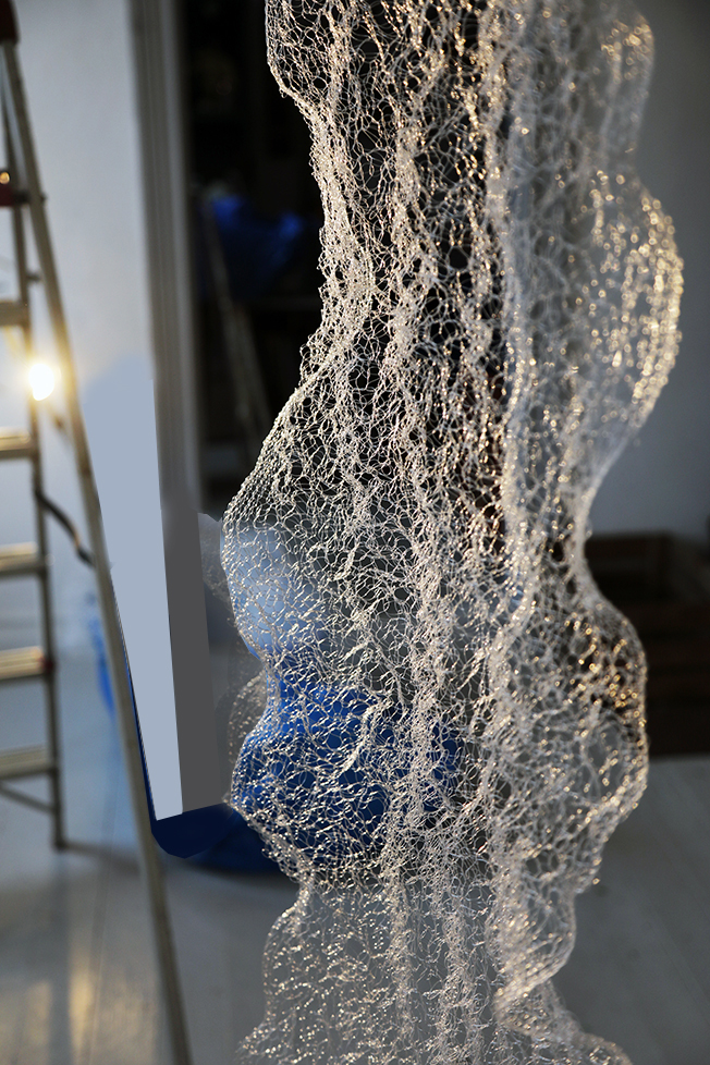– Det var under en residensvistelse i Indien som jag påbörjade kokongerna. För några år sedan upptäckte jag fiskelinor som material. Fiskelinor fanns också nyligen på Sofiero i en ljusinstallation formad som ett moln, där jag använde fyra mil fiskelina.