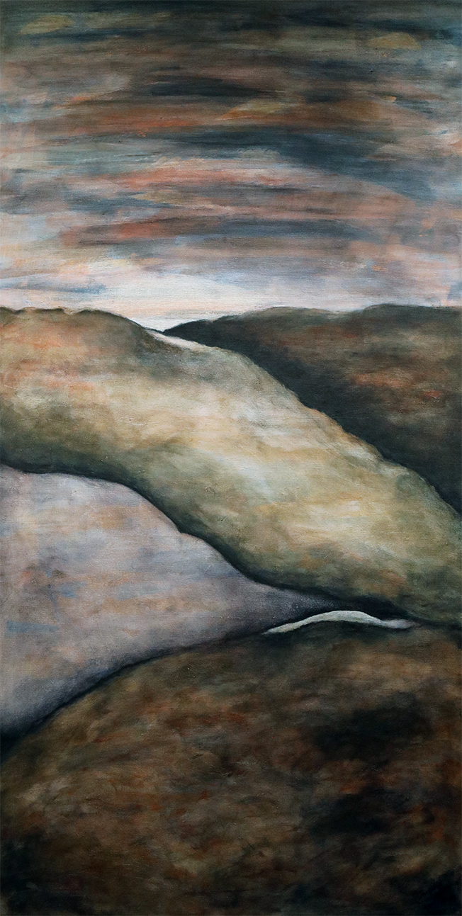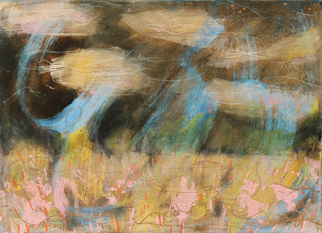 Två stora akrylmålningar dominerar i det breda utbudet. En formsäker och kraftfull naturmålning med titeln Nattens ljus visar förnimmelser och visioner av en dröm Snuffa upplevt.